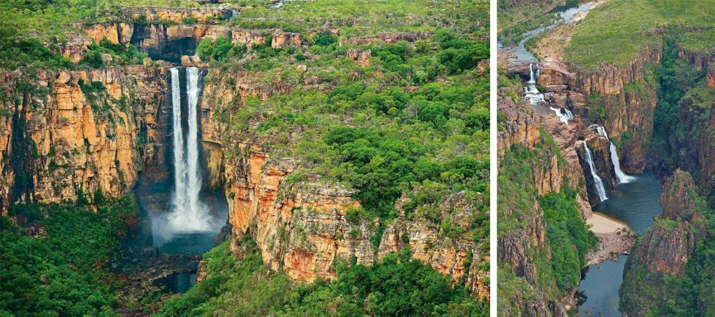 Jim Jim Falls et Twin Falls sont les chutes d’eau les plus populaires du parc. Les routes qui y mènent sont praticables en véhicule tout terrain pendant la saison sèche et fermées durant la saison des pluies. Les Twin Falls sont approvisionnées en eau tout au long de l’année contrairement aux Jim Jim Falls qui sont réduites à un petit filet d’eau pendant la Dry.