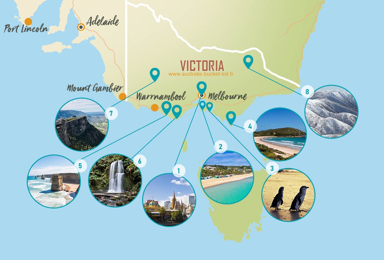Melbourne est la capitale du Victoria ainsi que la deuxième plus grande ville du pays. Ses rues animées et son architecture vous séduiront à coup sûr. De nombreux points touristiques sont à ne pas manquer pour profiter pleinement de cette ville comme la jolie gare de Flinder Street, le Queen Victoria Market, Federation Square, le Shrine of Remembrance, les Jardins Botaniques Royaux et beaucoup d’autres. Bon à savoir, la ligne de tramway Circle Tram est gratuite et vous permet de vous déplacer dans le centre de la ville librement et facilement. Très facile à repérer avec les wagons bordeaux au style très rétro.